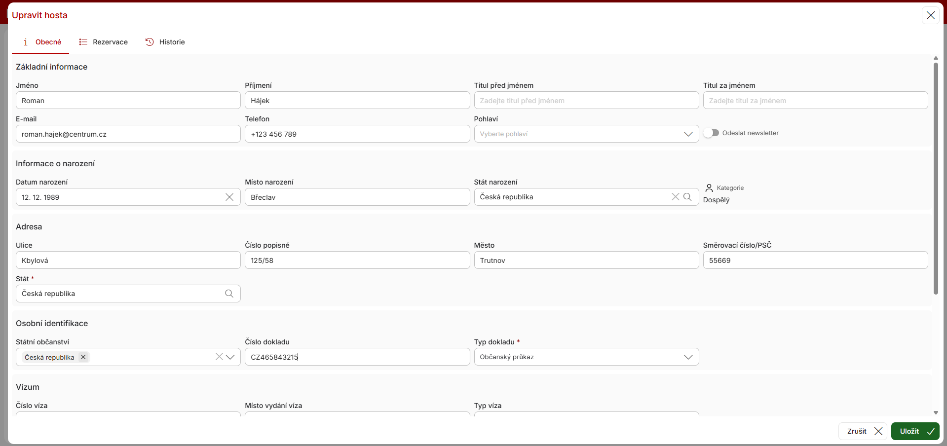 Přes ikonu tužky (nebo dvojklikem na řádek) u každého jednotlivého hosta se dostanete do karty daného hosta (totožné okno jako v případě vyplňovaní této karty přímo v rezervaci). Zde už pouze v první záložce můžete upravovat veškeré dostupné informace o klientovi, přičemž v druhé záložce tohoto okna máte kompletní historii rezervací daného klienta. Poslední záložka pak obsahuje „historii“ hosta, tzn. informace o editaci záznamů tohoto hosta.