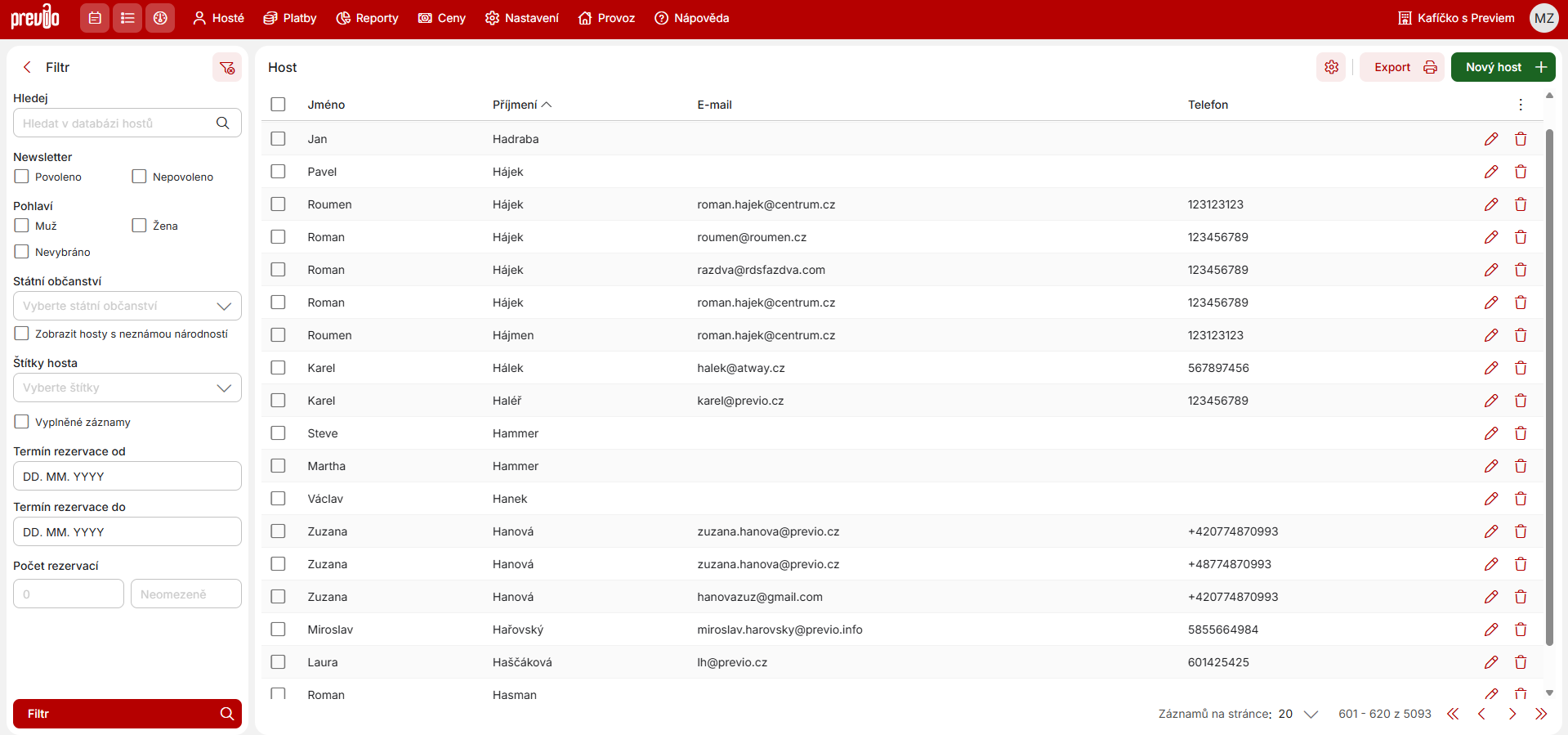 Databáze hostů obsahuje veškeré záznamy o hostech z rezervací, které Vám kdy přišly z rezervačních portálů, přes rezervační formulář, nebo které jste si v Previu vytvořili ručně. Pro každého zadaného hosta je vytvořen záznam v databázi, který obsahuje veškeré údaje daného klienta, které jste do jeho karty hosta v rezervaci doplnili (jméno, adresa, datum narození, národnost, číslo dokladu, SPZ, email, telefon, nebo případně štítky a poznámky přiřazené k tomuto hostovi).