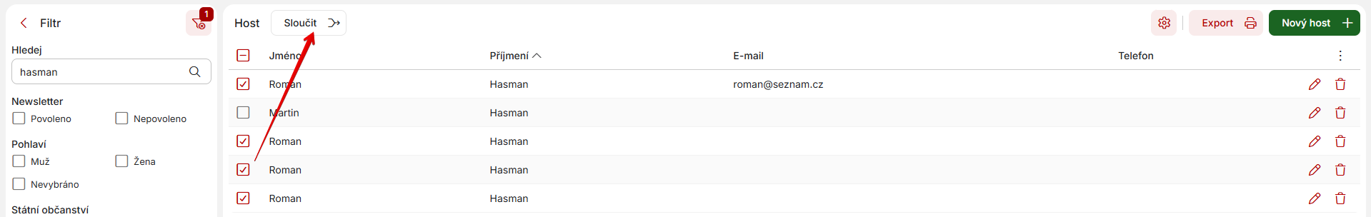 Hosty je také možné slučovat v případě, že se Vám v systému objeví duplicity. Stačí si konkrétní jméno vyfiltrovat a vybráním jednotlivých záznamů a kliknutím na tlačítko „Sloučit“ jednotlivé záznamy sjednotit. V následném okně ještě potvrdíte, do kterého záznamu se mají všechny duplicity sloučit.