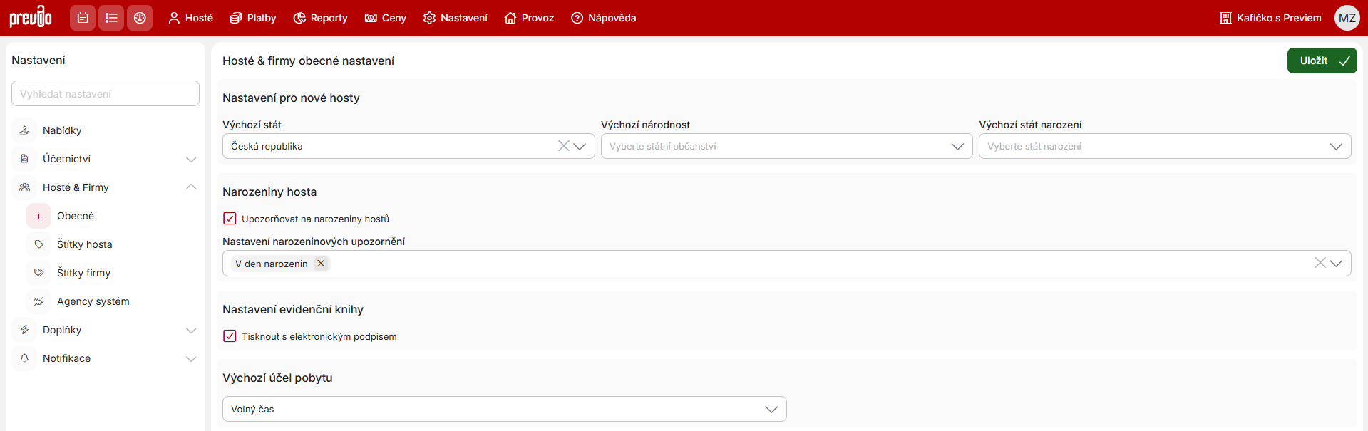 V hlavní „Obecné“ sekci nastavujete upozornění na narozeniny ubytovaných hostů, nastavení výchozí národnosti hostů, tisk elektronických podpisů a výchozí účel pobytu.