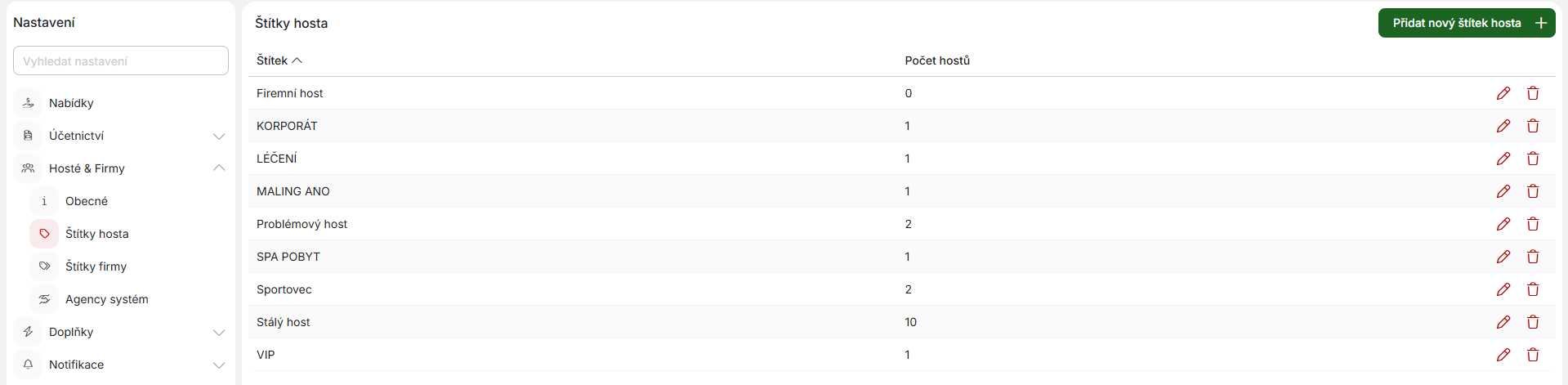 V další sekci nastavení pak naleznete správu štítků hostů. Můžete si hosty pomocí štítků rozřadit do různých kategorií a následně s nimi dále pracovat. Na základě štítků: