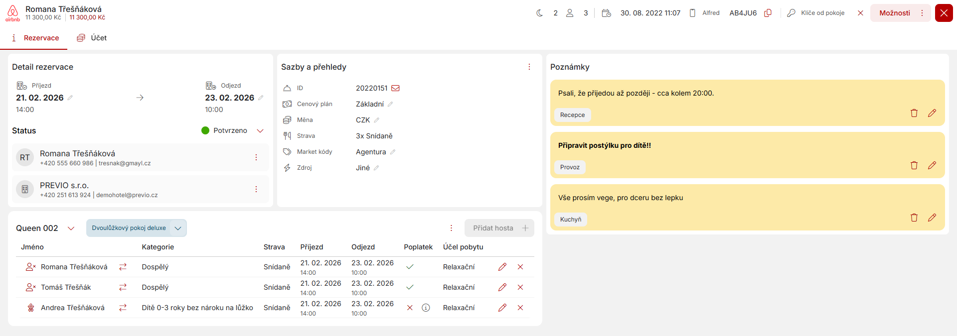 - Kontaktní osoba – (na screenu výše Romana Třešňáková) obvykle objednávatel rezervace. Může se ale lišit od hostů zadaných v rezervaci.