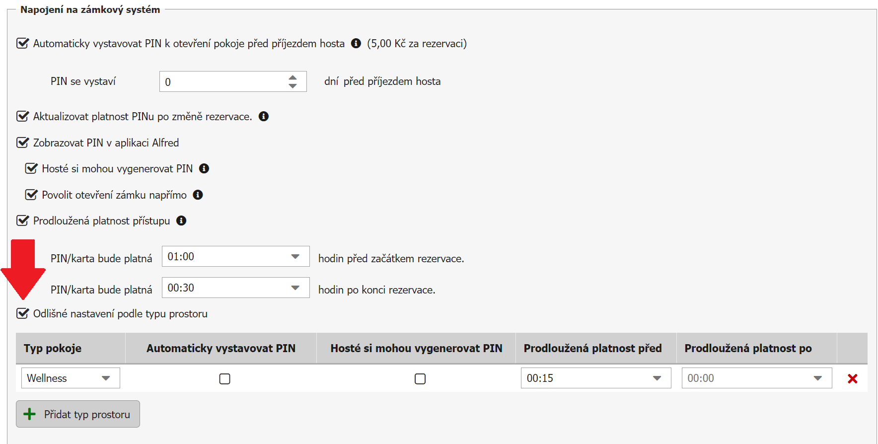 V tomto ilustračním případě vystavujeme hostům PINy pro pobyt automaticky a umožňujeme jim vstup do hotelu už hodinu před začátkem rezervace. Wellness jsme si ale nastavili odlišně, a to tak, že PINy se automaticky vystavovat nebudou, a vstup do prostoru bude umožněn pouze 15 minut před začátkem rezervace.nu