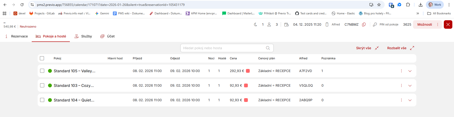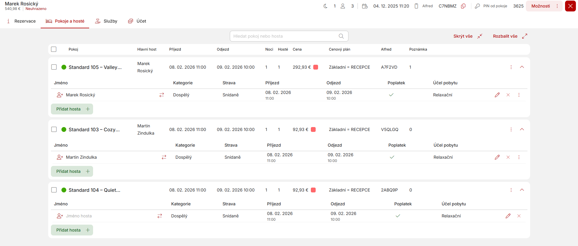 Podrobnější informace o jednotlivých pokojích naleznete pak v záložce „Pokoje a hosté“ v horní liště. Tato sekce pak obsahuje detaily všech pokojů ve skupině a možnost jejich jednotlivé ale i hromadné editace. Po otevření sekce je ve výchozím nastavení zabalená a některé detaily jsou skryté (např. jména všech hostů), viz níže.