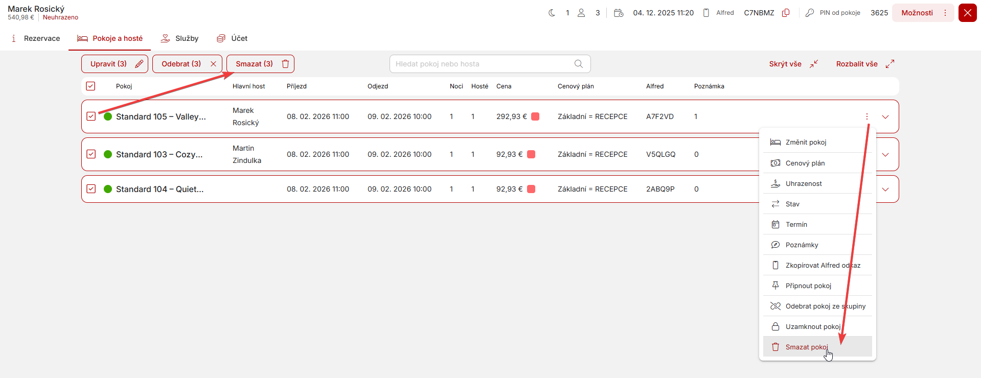 - V detailu skupiny je možné zaklikat pokoje, které chcete smazat ze skupiny a následně je hromadně smazat pomocí tlačítka nad tabulkou.
