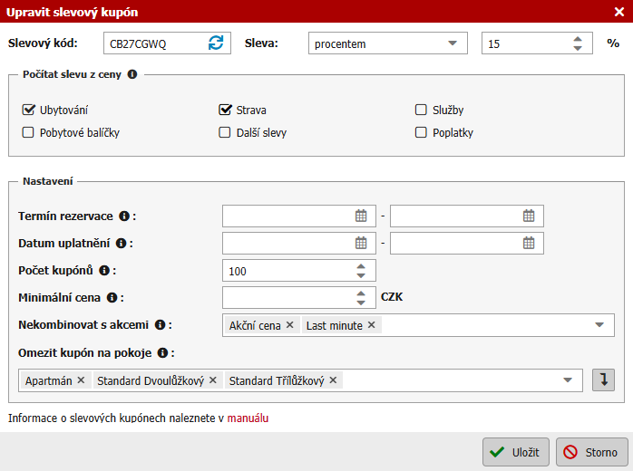 - Datum uplatnění – v jakém období mohou host kupón uplatnit, resp. zadat do rezervačního formuláře.