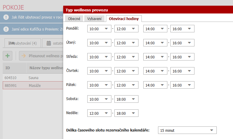 V rámci nastavení prostoru (Nastavení / Hotel / Pokoje), na který vážete službu, můžete nastavit dvě další věci, které ovlivní tvorbu rezervací. Konkrétně se jedná o:
