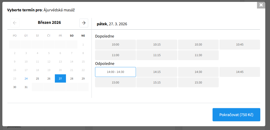 Výsledné vybrané termíny pak mohou vypadat např. takto. Máme objednané dvě různé masáže na konkrétní termín a u druhé lymfatické masáže si zatím nejsme jisti termínem.