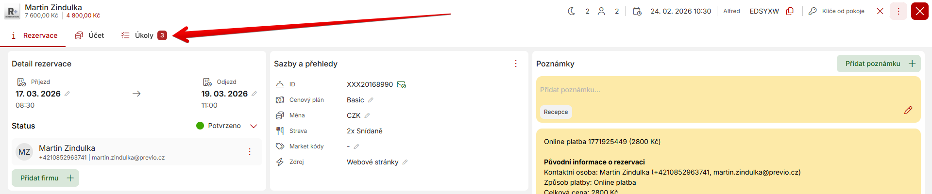 Ve verzi PRO naleznete v detailu rezervace také samostatnou záložku propojenou na modul Úkoly. Ta Vám zobrazí všechny založené úkoly, které jsou vázané na konkrétní rezervaci. Pokud jsou v rezervaci nějaké otevřené úkoly k řešení, zobrazí se Vám jejich počet hned vedle názvu této záložky.