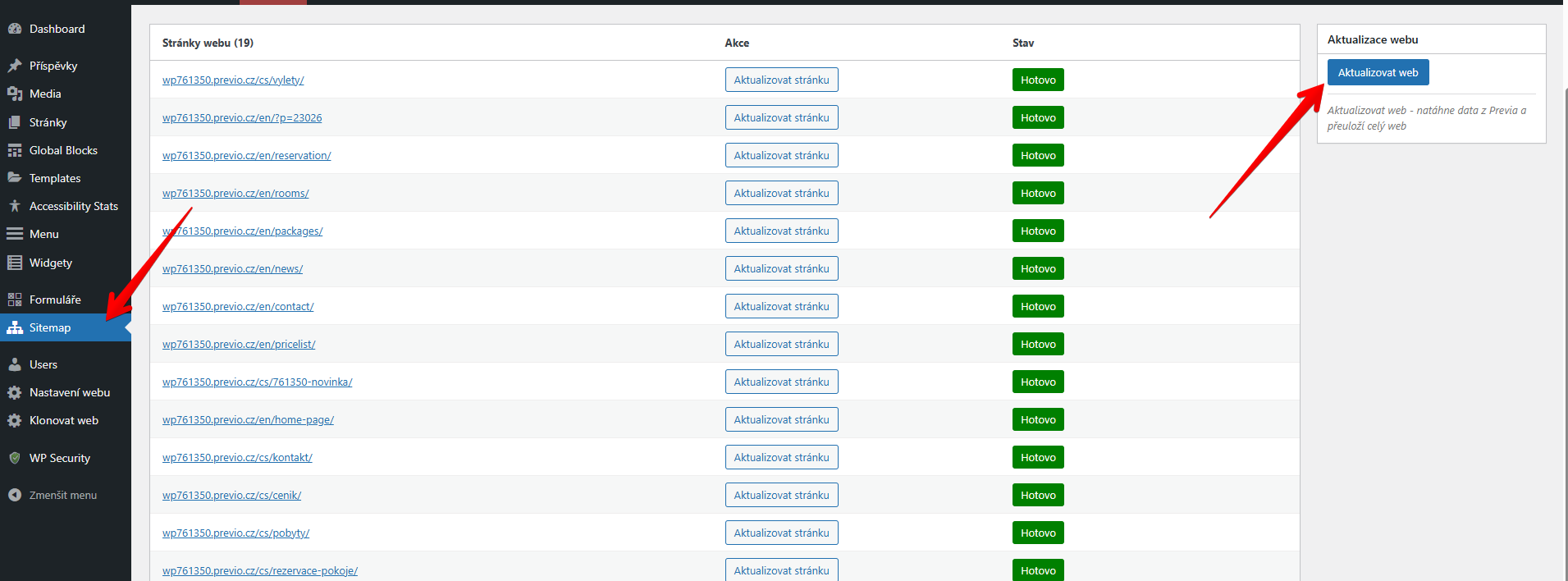 Po uložení změn v menu, přejděte vždy do sekce „Sitemap“ v levém bočním menu, kde následně vpravo uvidíte tlačítko „Aktualizovat web“, na které klikněte. Jednotlivé podstránky v seznamu zezelenají a Váš web bude přenačten/aktualizován podle nejnovějších úprav.