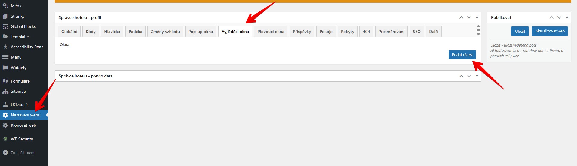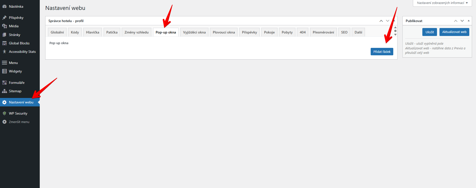 Vyskakovací okno nastavíte v sekci Nastavení webu v levém menu, kde vyberete možnost přidat řádek.