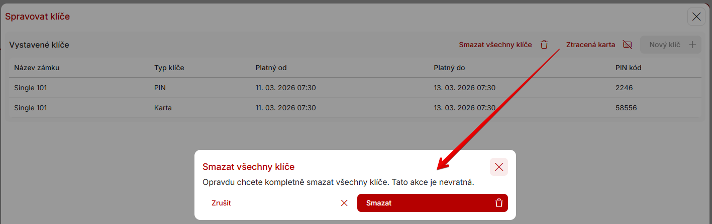 Zrušení klíče probíhá buď přes tlačítko s červeným křížkem nebo případně přes spodní tlačítko Ztráta klíče. V obou případech je princip podobný – klíče budou smazány z tabulky a možnost přístupu přes daný klíč bude zrušena.