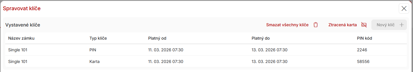 Po rozkliknutí nabídky klíčů se Vám objeví tabulka se všemi již vystavenými klíči. Ty mohou být nahrány na kartu nebo zaslány do mobilu. Typ vystaveného klíče je rozlišen ikonkou karty a telefonu.