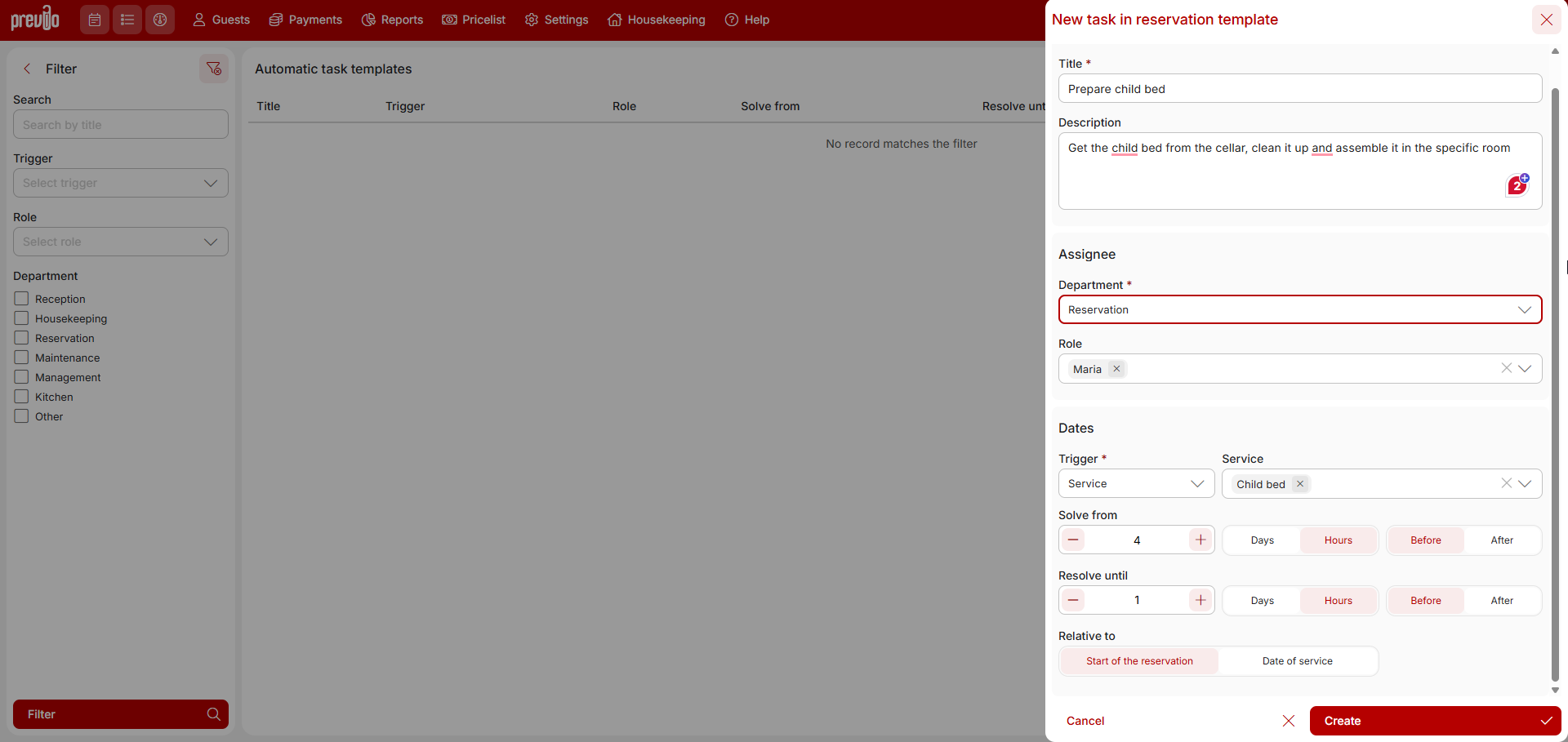 After that, everything will be fully automatic. That is, if the “child bed” service is added to the reservation account (manually, when booking a stay and service via R+ or via the Alfred app), a new task will be created for the corresponding user and assigned to the specific reservation.
