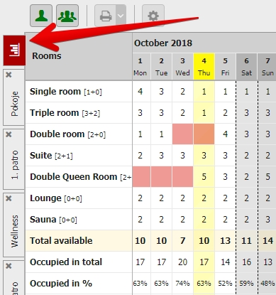 You will find another useful thing in the top left side of your calendar which is called Available rooms. This tab gives you quick overview of your available rooms and occupanc. Each row here represents room type not certain room.