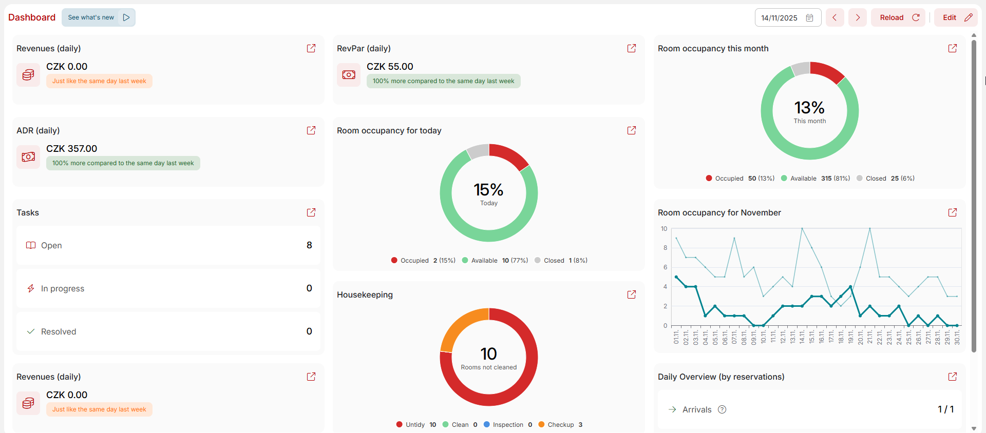 The dashboard layout is saved separately for each user. So you don’t have to worry that your changes will affect the display for your colleagues. At the same time, you will see your saved display the same way in every accommodation facility to which you have access in Previo.