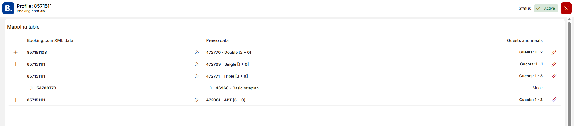 Clicking on the pencil icon for a specific channel will take you to the connection details. Here you will see a complete mapping, i.e., information about which rooms from Previo are connected to specific rooms on that channel. For each mapping row, you can also see which Previo rate plan is connected.