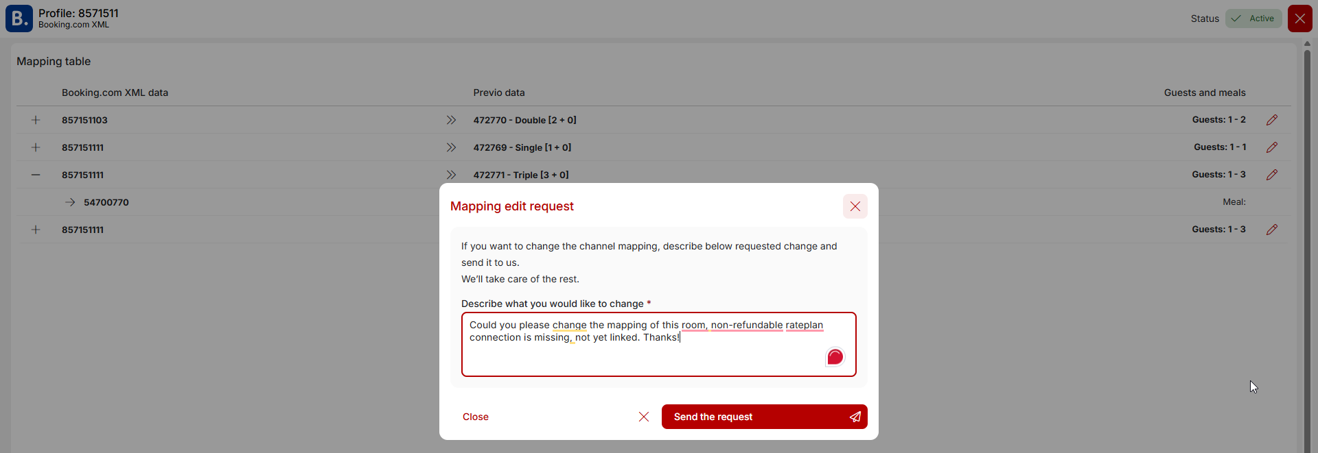 Next to each mapping row, there is a pencil icon that you can use to request a mapping change. This means that if you need to make any changes to the connection, you can send a message directly to our channel manager team. They will then have accurate information about what changes need to be made, and if anything is unclear, they can contact you directly to ask for clarification of your specific request.