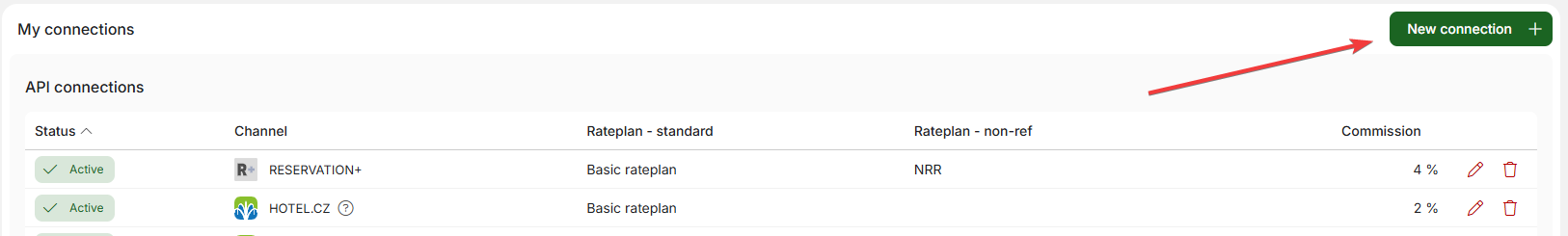 At the top of the module, you will also find the New Connection+ button. This will redirect you to the Marketplace module, which is described in a separate article. In this module, you can request the connection of new booking channels and, if necessary, expand existing connections (e.g., request the connection of a new Booking.com profile for apartment operators).