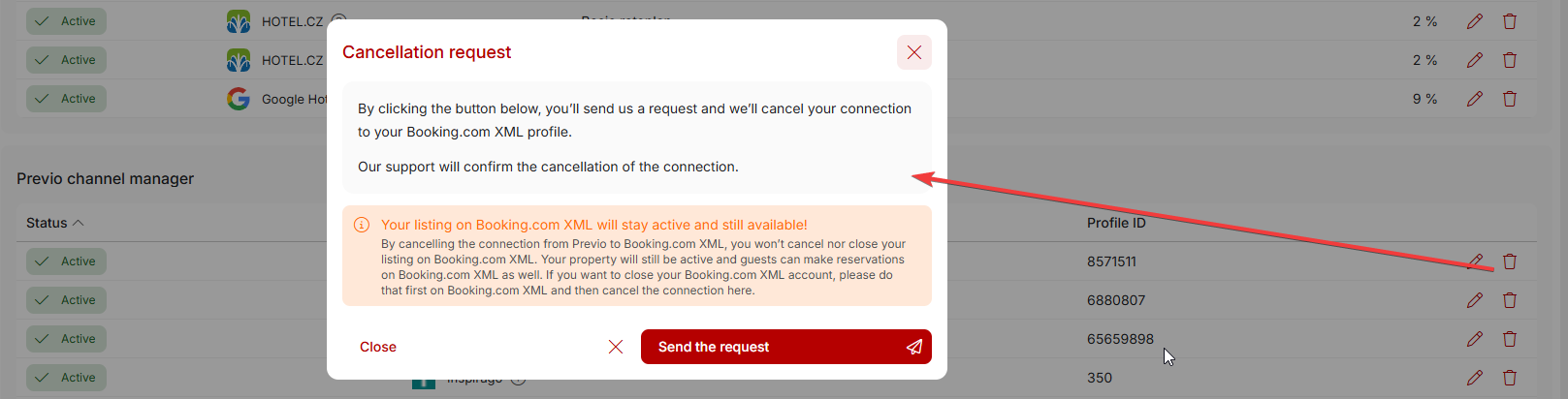 For most partners (primarily in the channel manager section), it is important to know that you must first cancel/deactivate your profile on the given portal and only then deactivate the connection on the Previo side. If the disconnection is done on our side first, we will stop sending price and occupancy data to the portal, but your profile on the portal will remain active without synchronization with Previo, which may result in overbooking.