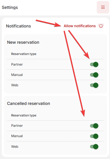 Then all you need to do is enable notifications and select what you want to be notified about. Specifically, you can enable notifications for new reservations and cancellations. You can also choose whether you want to be notified about reservations from partners (Booking, Airbnb, etc.), manually created reservations, and reservations made via the website (R+).