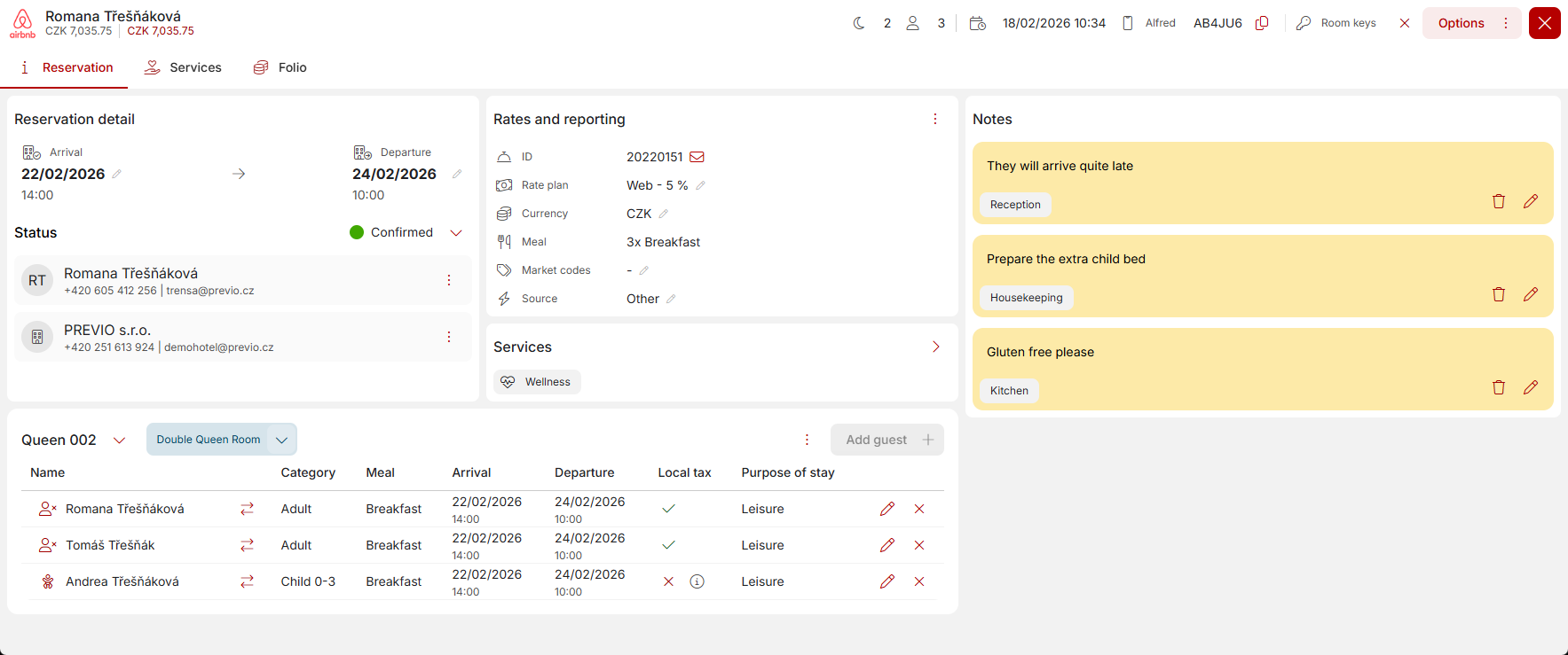 - Contact person – (Romana Třešňáková in the screenshot above) usually the person who made the reservation. However, this may differ from the guests specified in the reservation.