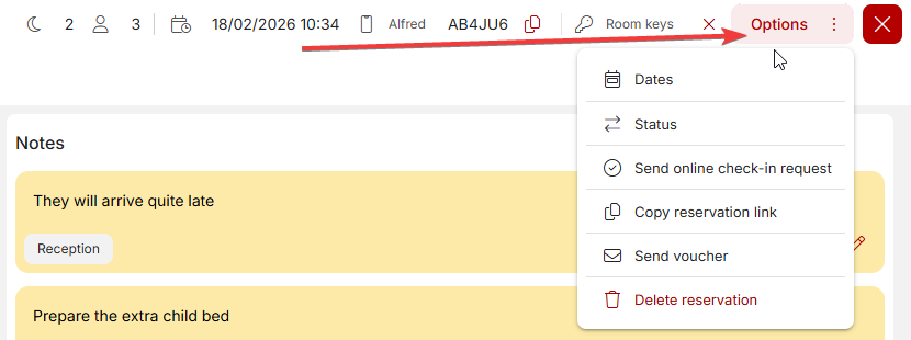 - “Options” button – where you will find, for example, manual sending of check-in requests, sending vouchers, etc., deleting reservations, etc.)