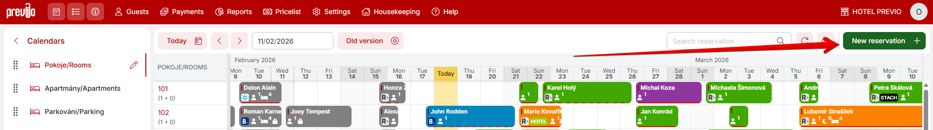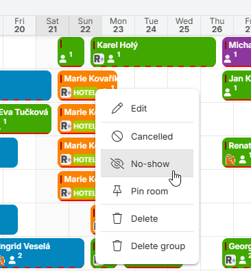 You can find basic information about a reservation by looking at the reservation itself without having to display the preview. The color of the entire reservation corresponds to the status of the reservation (option, confirmed, accommodated, terminated, other).