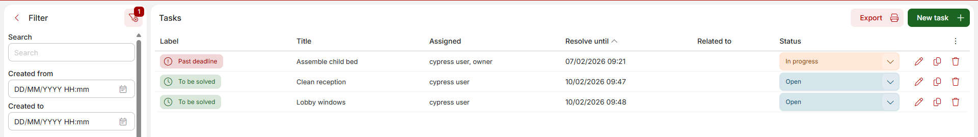 Each task can be edited (yellow pencil icon) or deleted (red cross icon) from the table. You can also change the status of the task, which means switching task to “being solved” or “solved” status.