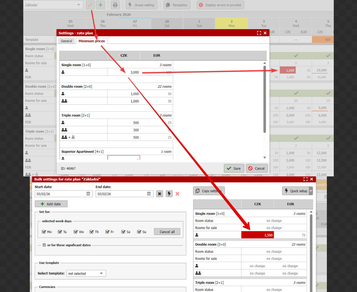 - #27191 – Minimum price settings added to rate plan settings. When filling in prices, user is warned that set price is bellow the set limit value. For derived rateplans, min. value is calculated automatically from the parent rate plan.