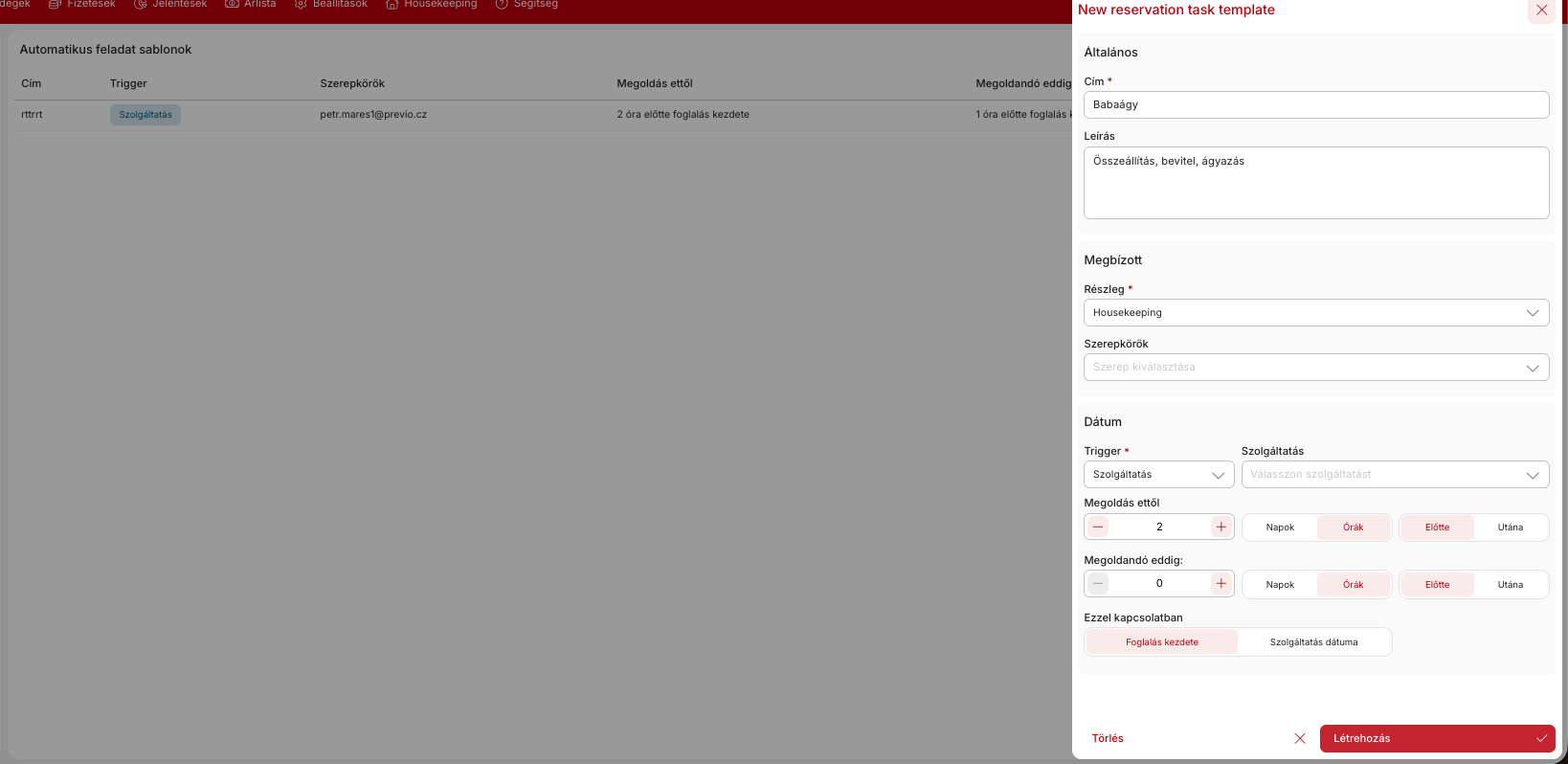Ezt követően minden teljesen automatikusan fog történni. Vagyis, ha a „gyermekágy” szolgáltatás hozzáadódik a foglalási fiókhoz (manuálisan, amikor a tartózkodást és a szolgáltatást az R+ vagy az Alfred alkalmazáson keresztül foglalják), akkor egy új feladat jön létre a megfelelő felhasználó számára, és hozzárendelődik a konkrét foglaláshoz.