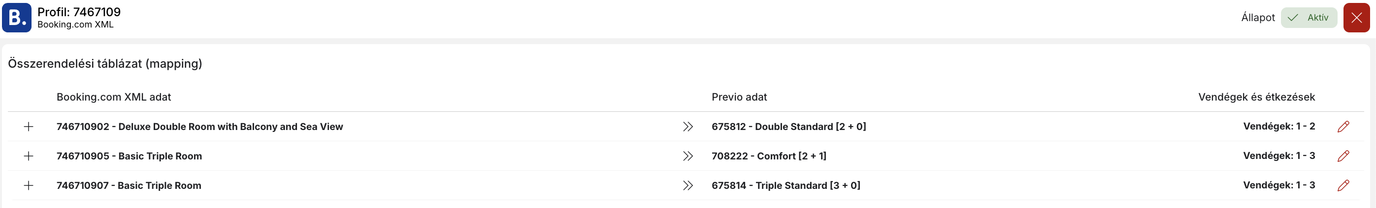 Egy adott csatorna ceruza ikonjára kattintva, a kapcsolat részleteihez jutunk. Itt látható a teljes mapping (összerendelés), azaz azt, hogy a Previo mely szobatípusai kapcsolódnak a csatorna adott szobatípusaihoz. Minden mapping sorban látható azt is, hogy melyik Previo árlista kapcsolódik hozzá.