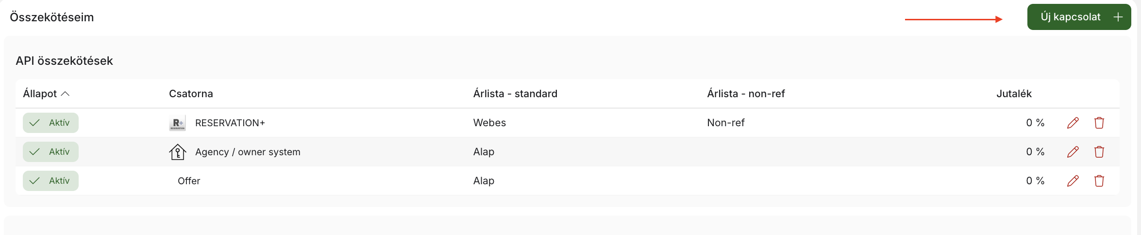 Ebben a részben az összes, Channel Manager rel összekötött aktív kapcsolatát láthatjuk. Ezek többsége külföldi portál (például Booking.com, Expedia, Airbnb stb.), de hazai partnerek is megjelenhetnek a csatornák között.