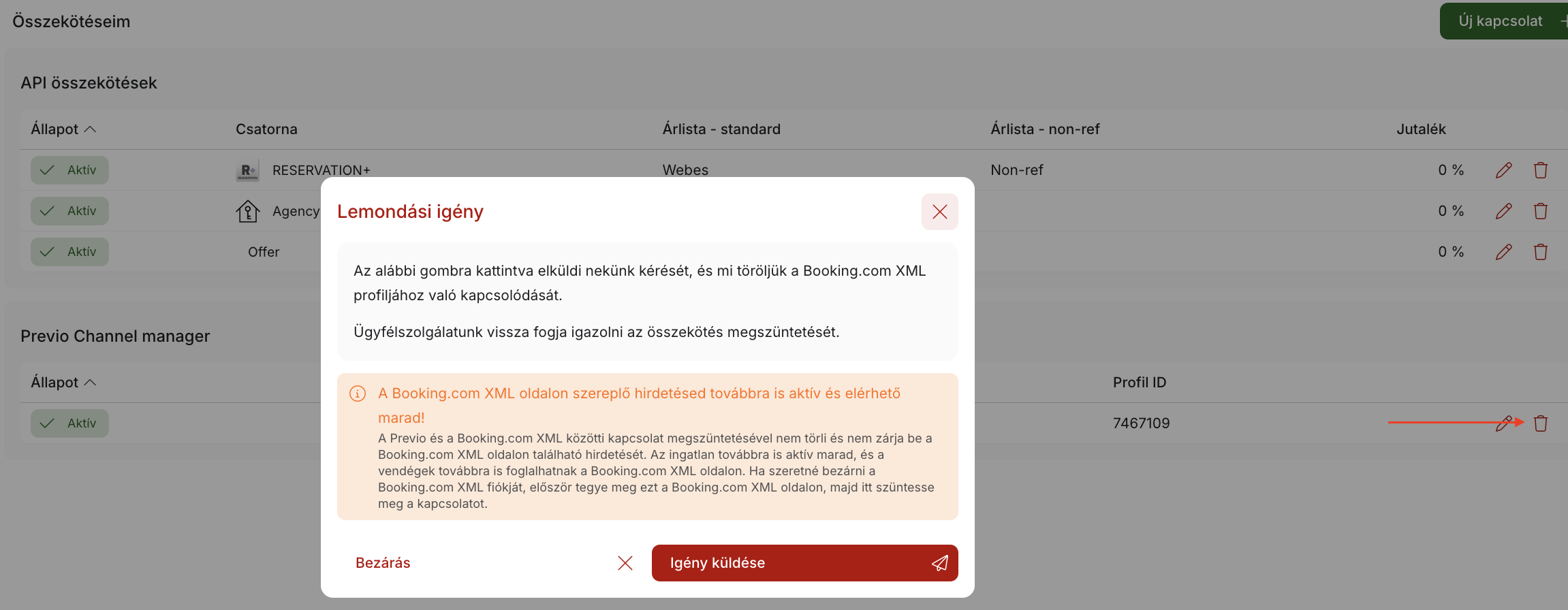 Ha bármilyen okból meg akarnánk szüntetni az együttműködést egy adott foglalási portállal, akkor közvetlenül a Kapcsolataim modulból küldhető csapatunknak kérelem a kapcsolat megszüntetésére, ha rákattintunk a kérdéses partner “szemét” ikonjára.