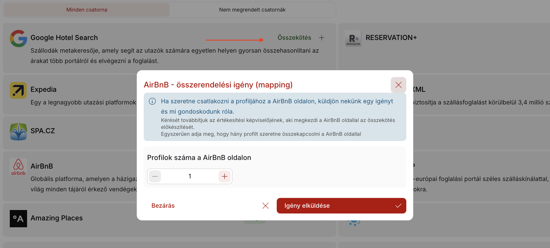 A már csatlakoztatott portálok esetében lehetőség van a meglévő kapcsolat kiterjesztésére új profillal. Ez különösen előnyös, ha Ön apartmanüzemeltető, és szálláskínálatát további, saját profillal rendelkező apartmanokkal bővül, pl. a Booking.com vagy az Airbnb oldalakon. Egy adott portál esetében egyszerűen növelhető az igény a csatlakoztatott profilok száma kapcsán.