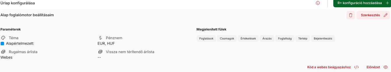 Az első konfiguráció mentése után az megjelenik a listában, és most már tetszőleges számú további konfigurációt hozhatunk létre. A előnézet gombbal vagy a weboldalba beillesztendő kód megjelenítésére szolgáló gombbal visszatérhetünk az előkészített konfigurációhoz.