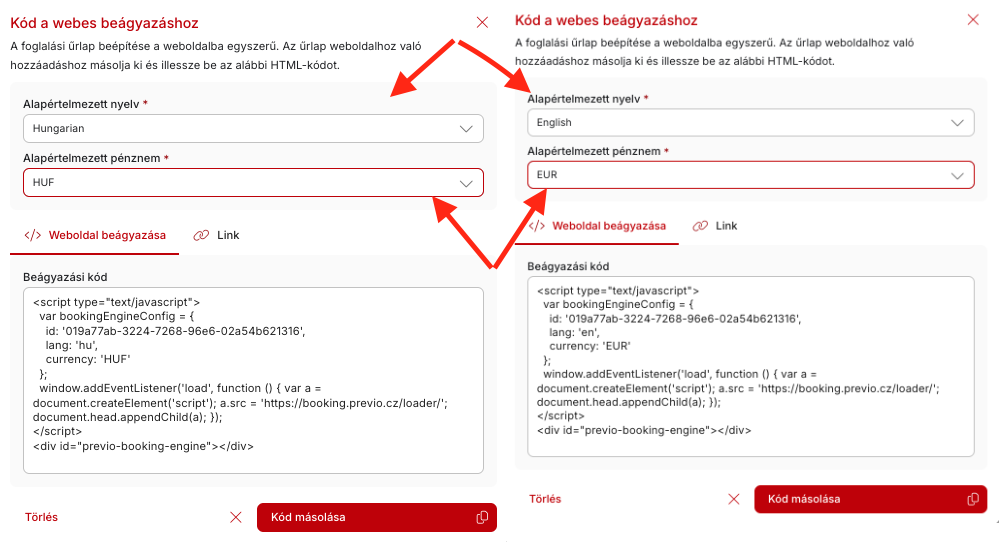 Nyissuk meg a Csomagok konkrét konfigurációjának kódját, és szükség szerint állítsuk be a nyelvet és a pénznemet. Az alábbi kód módosításra kerül, és a módosított kódot beilleszthető a Csomagok oldal angol/magyar nyelvű változatába.