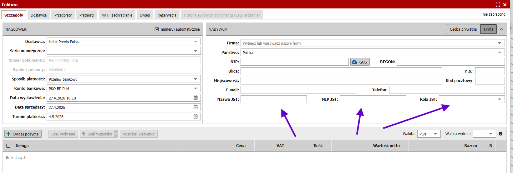Jeśli uzupełnisz NIP, jest on walidowany po stronie BSX.
