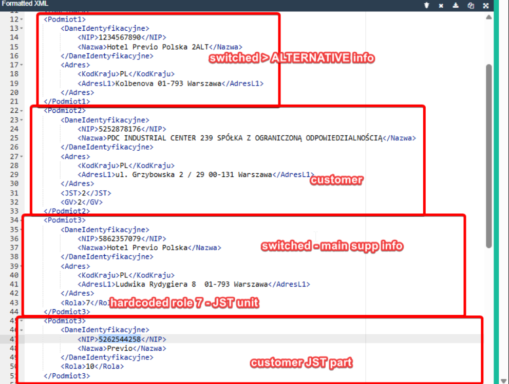 (alternatywny dostawca jest ustawiony jako Podmiot1, Podmiot2 nadal jest klientem, a w naszym przykładzie są 2× Podmiot3, jeden po stronie dostawcy zawiera dane głównego dostawcy z na sztywno ustawioną rolą 7, a drugi to dodatkowe dane klienta). To ostatnie to najbardziej złożony przypadek, gdzie mamy 4 podmioty.W sumie mogą wystąpić następujące sytuacje: