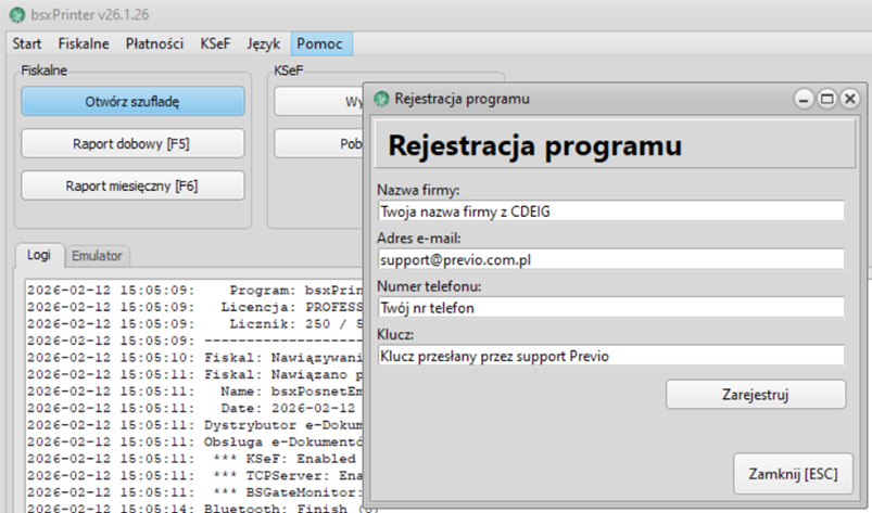 Po otrzymaniu klucza licencyjnego uruchom aplikację i przejdź do zakładki Pomoc, następnie Rejestracja programu. Wpisz otrzymany klucz i kliknij przycisk Zarejestruj: