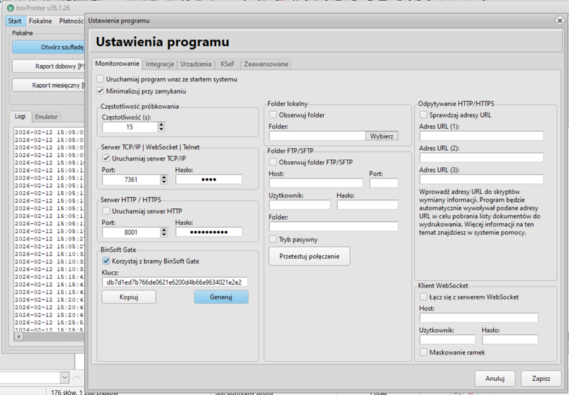 Uruchom aplikację bsxPrinter i w górnym menu przejdź do Start, następnie Ustawienia, a potem Monitorowanie. Włącz opcję „Korzystaj z bramy BinSoft Gate” i kliknij „Generuj”, a w nowym oknie wybierz „Tak”. Następnie kliknij w prawym dolnym rogu przycisk „Zapisz”, po czym okno zostanie zamknięte.