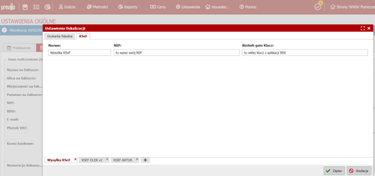 Teraz zaloguj się do systemu Previo na koncie administratora i przejdź do menu Ustawienia, następnie Obiekt noclegowy, Podstawowe, Informacje rozliczeniowe, Ustawienia fiskalizacji oraz KSeF. W polu BinSoft Gate klucz wklej wcześniej skopiowany unikalny klucz. Następnie wpisz numer NIP firmy, na który będą wysyłane dokumenty do KSeF. Jeżeli w ramach jednej licencji Previo obsługujesz więcej niż jedną firmę, dodaj osobne zakładki KSeF dla każdej z nich. Nadaj konfiguracji nazwę, na przykład „Wysyłka KSeF”: