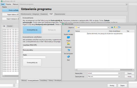 Następnie ponownie otwieramy aplikację bsxPrinter i w górnym menu przechodzimy do Start, następnie Ustawienia, Monitorowanie, KSeF oraz Uwierzytelnianie. Klikamy przycisk Uwierzytelnij się, a następnie zapisujemy na pulpicie plik „init.xml”. Ważne jest, aby w tym momencie nie wyłączać aplikacji bsxPrinter: