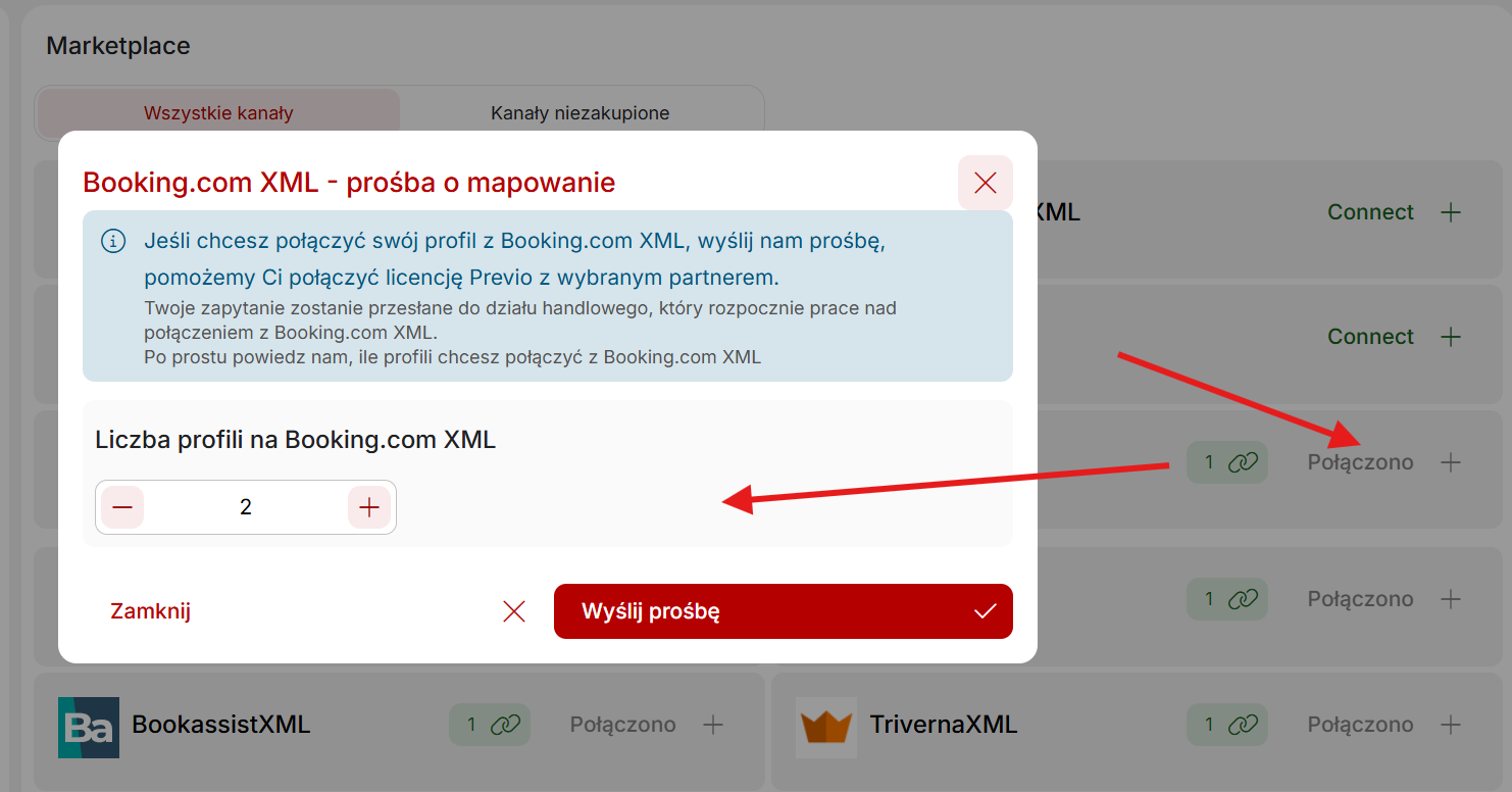W przypadku już połączonych portali masz również możliwość wnioskowania o rozszerzenie istniejącego połączenia o nowy profil. Jest to szczególnie korzystne, jeśli jesteś operatorem apartamentów i rozszerzasz swoją ofertę noclegów o kolejne apartamenty z własnymi profilami, np. na Booking.com lub Airbnb. W przypadku konkretnego portalu wystarczy zwiększyć liczbę połączonych profili, a skontaktujemy się z Tobą w sprawie dostosowania połączenia.