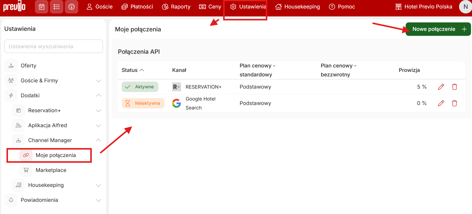 Znajdziesz tu pełną listę wszystkich partnerów rezerwacji online, z którymi Twój profil Previo jest połączony (lub z którymi prowadzisz negocjacje). Przegląd jest podzielony na dwie sekcje: połączenia API (które mogą obejmować system rezerwacji online od Previo, czyli nasz R+, GHS (Google Hotel Ads) lub innych, np. czeskich partnerów rezerwacyjnych)